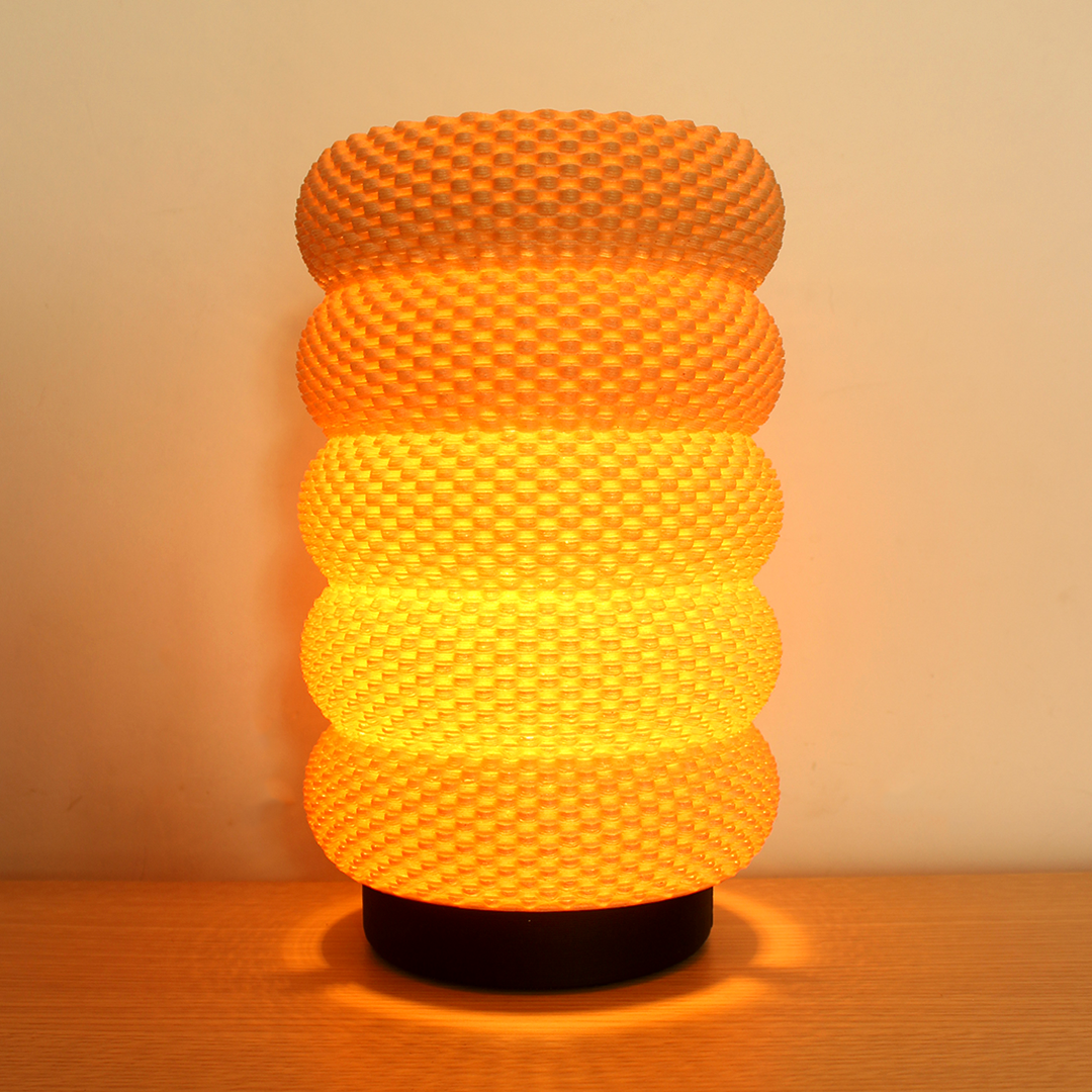 The lamp features a series of gently undulating, honeycomb-like rings that encase the light source, creating a mesmerizing play of shadows and light. When illuminated, Delfina exudes a warm, golden glow that transforms any environment into a sanctuary of comfort and tranquility. The intricate pattern of the shade not only enhances its visual appeal but also softens the light, providing a perfect balance of illumination and ambiance.