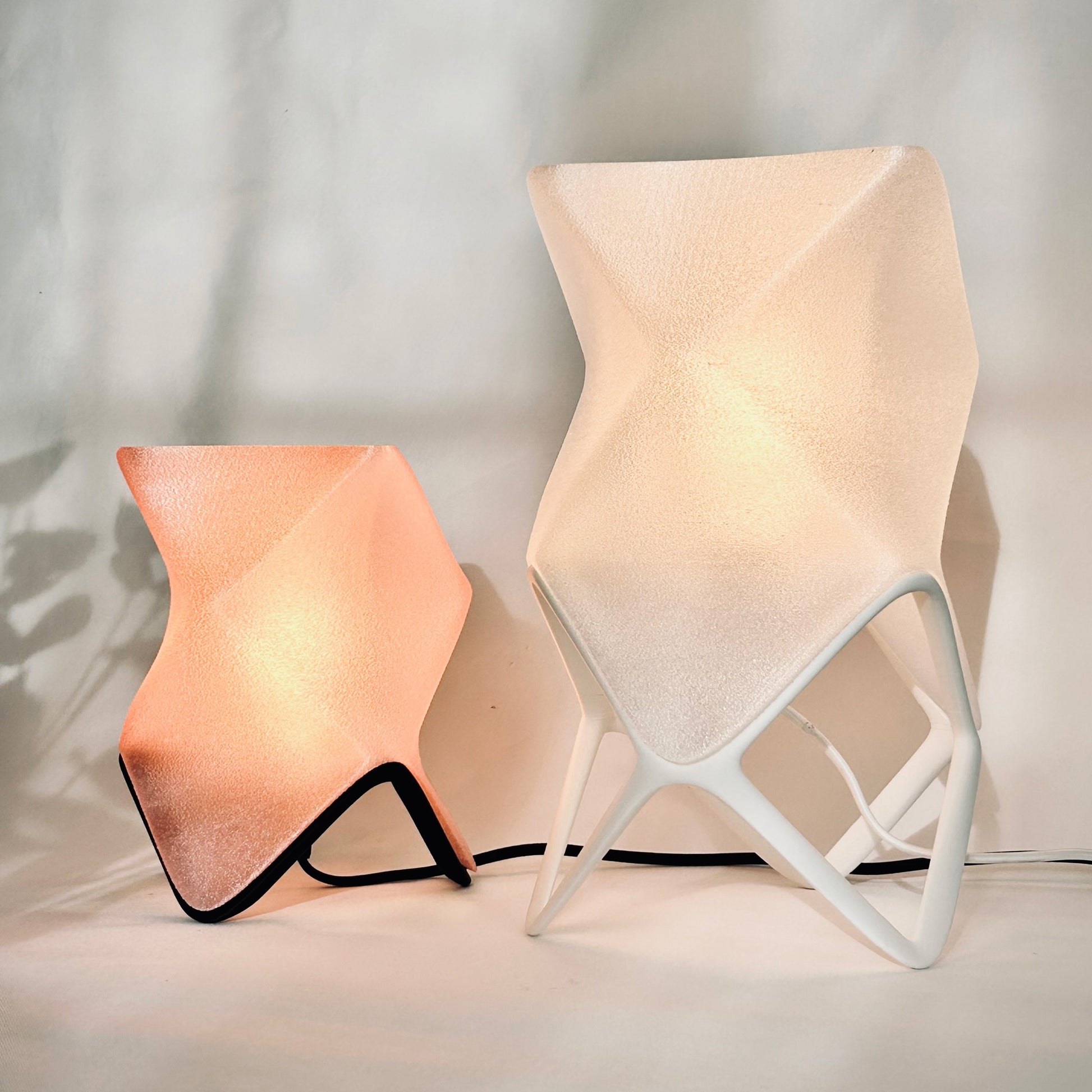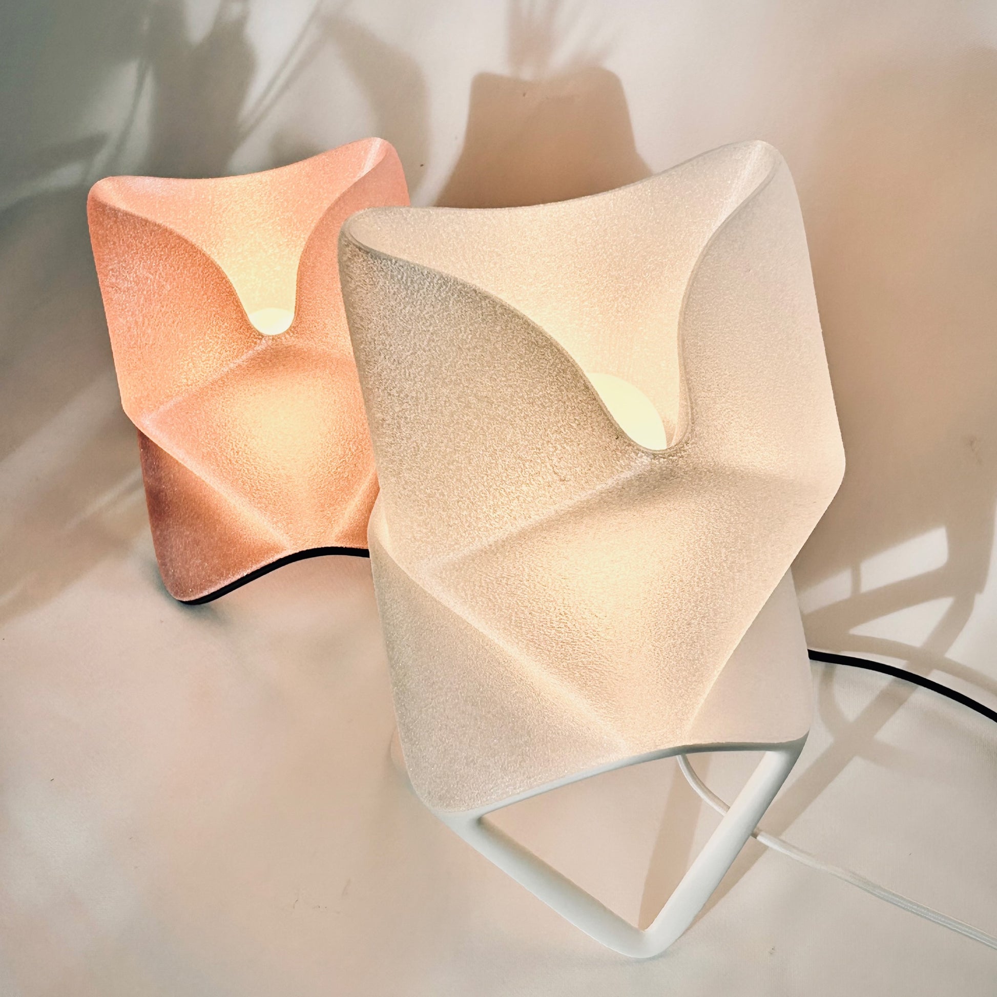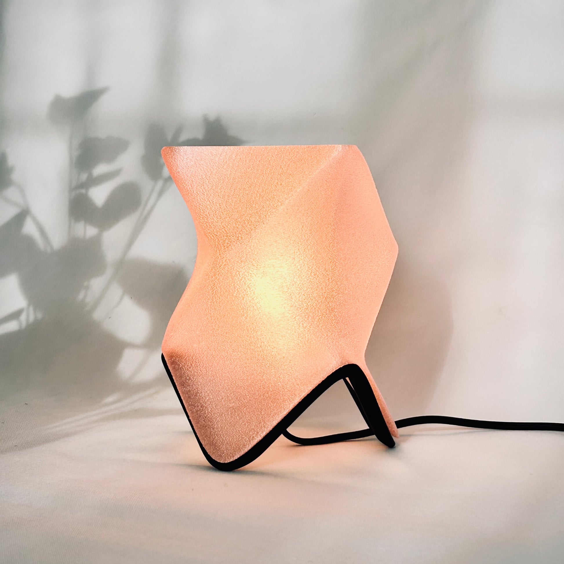 Available in two sizes, ORIGAMI offers multiple display modes. Placed flat, it feels like a glowing creature curled in repose. Set on its sculptural stand, it becomes an elevated beacon—leaning forward like it has something to say. The lamp shade itself diffuses a warm, ambient light that spills gently through its textured surface, revealing the peaks and valleys of its twisted geometry.