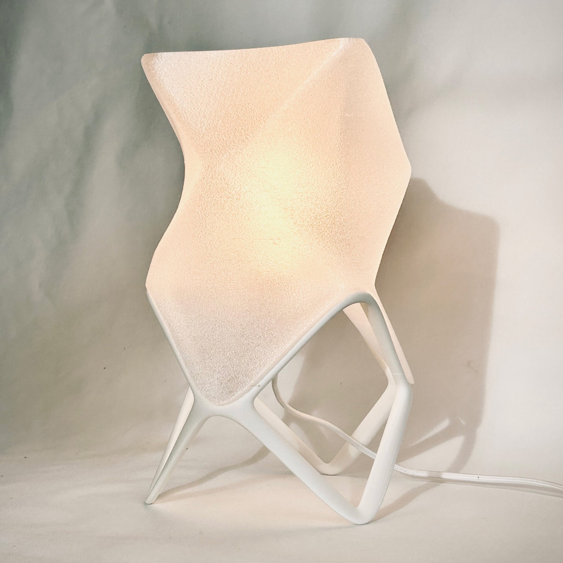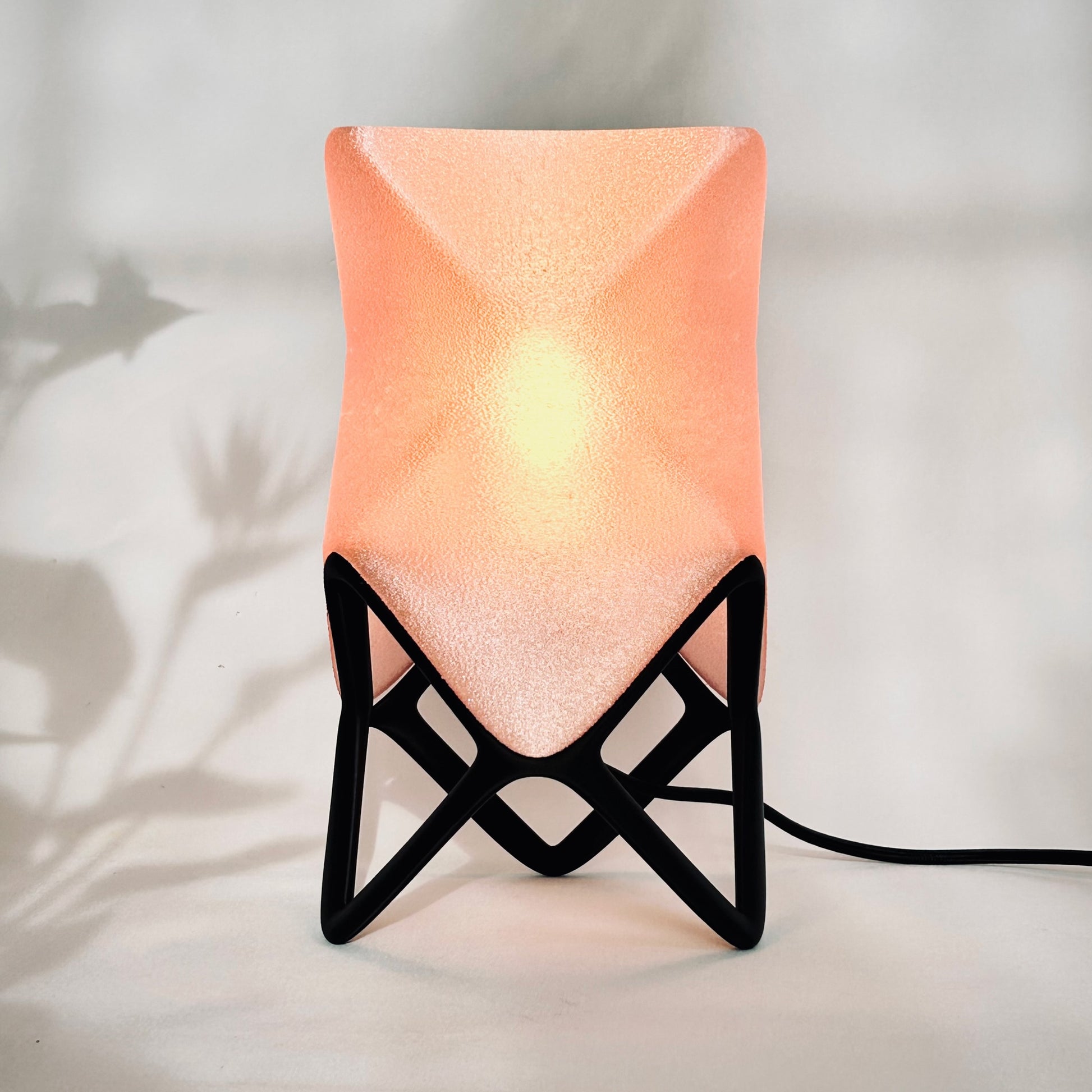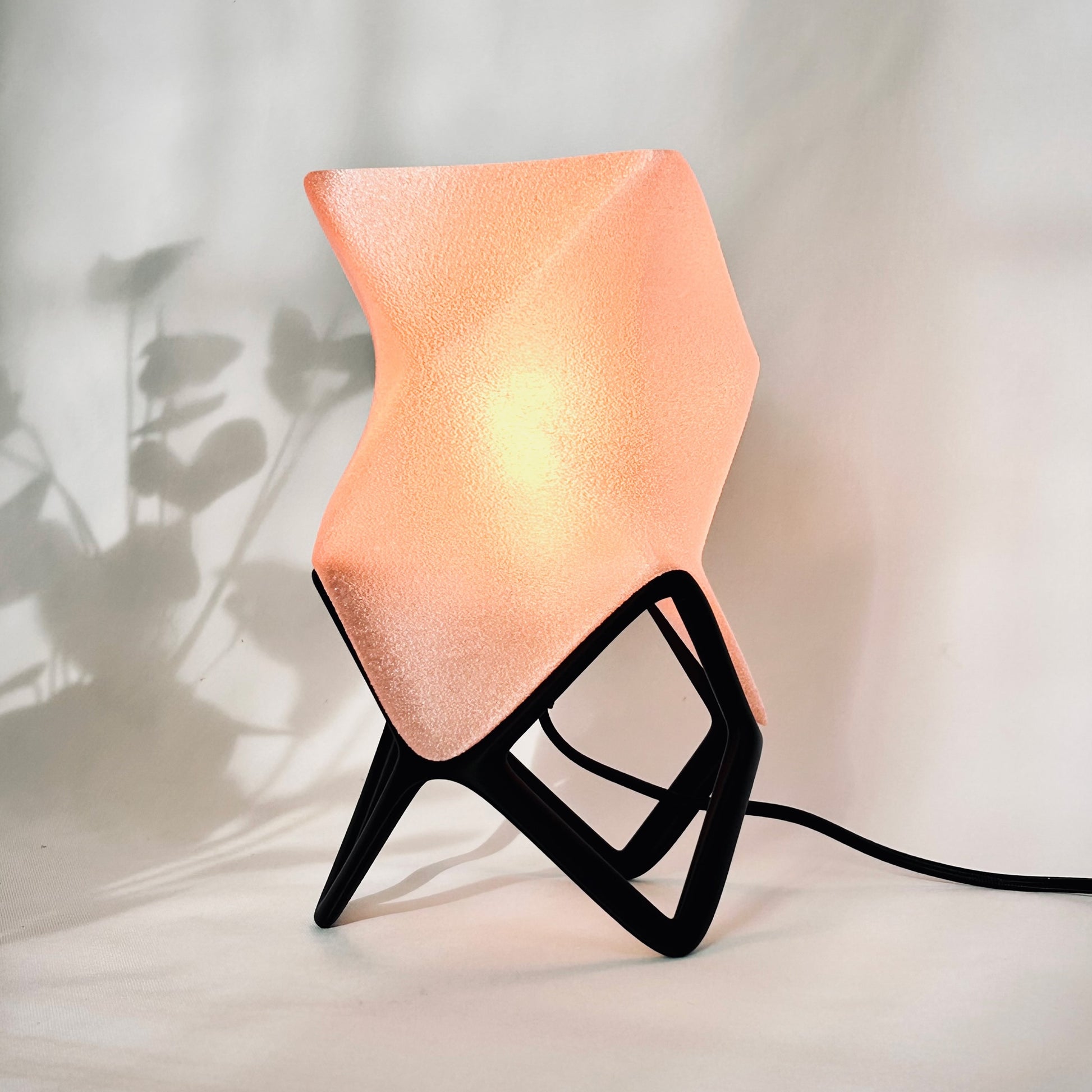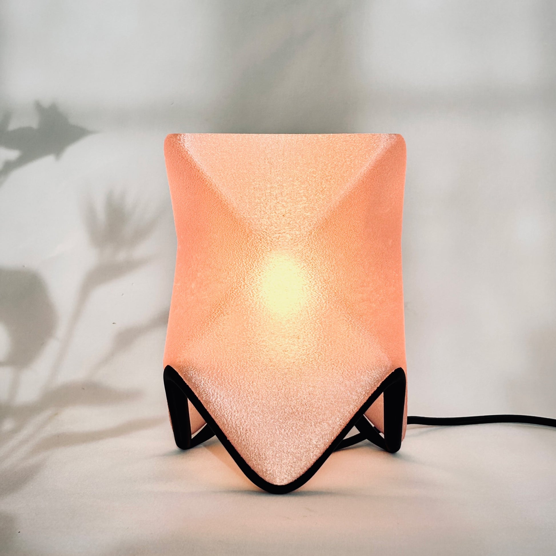Available in two sizes, ORIGAMI offers multiple display modes. Placed flat, it feels like a glowing creature curled in repose. Set on its sculptural stand, it becomes an elevated beacon—leaning forward like it has something to say. The lamp shade itself diffuses a warm, ambient light that spills gently through its textured surface, revealing the peaks and valleys of its twisted geometry.
