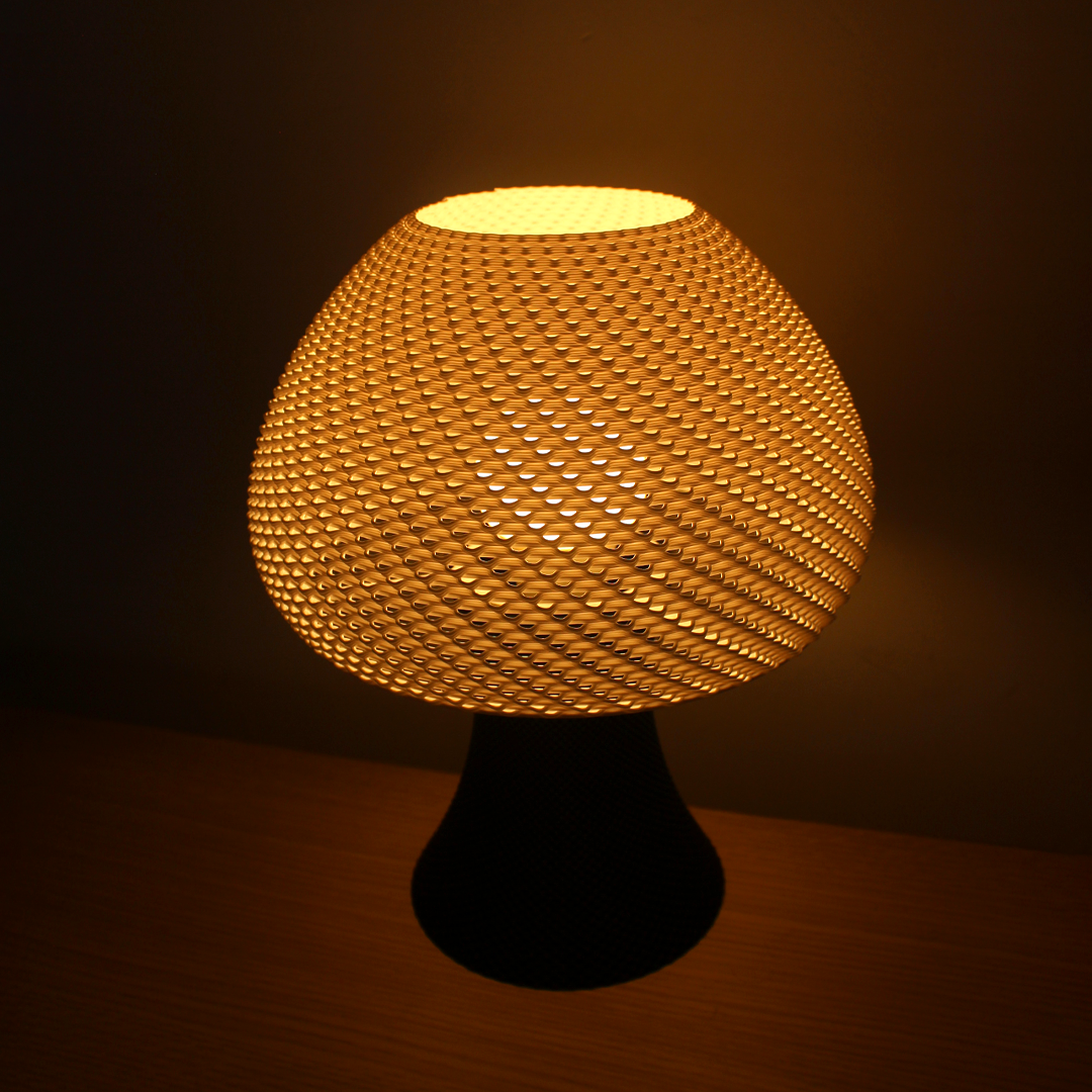 The lamp’s base is designed in a sleek, flared form that supports a dome-like shade, creating a harmonious balance of curves and lines. The intricate pattern of the shade, resembling delicate latticework, diffuses the light beautifully, casting a soft, ambient glow that enhances the coziness of any room. When lit, the Valentin Lamp transforms into a beacon of warmth and comfort, with its radiant light creating a mesmerizing play of shadows on surrounding surfaces.